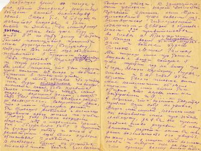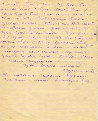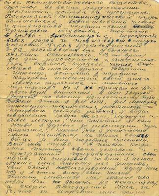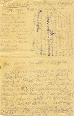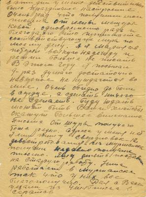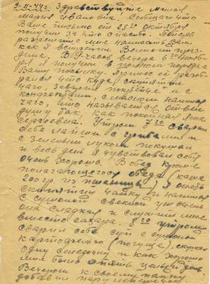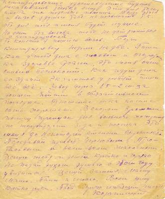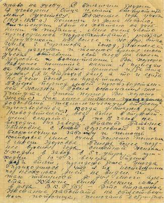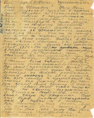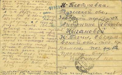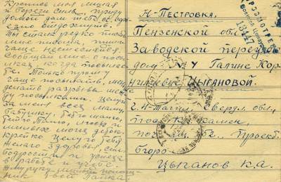 36. Письмо Цыганова К.А. от 01.02.1943 из г. Нижнего Тагила Свердловской области жене Цыгановой А.И. в Н.-Пестровку Пензенской области об отсутствии от нее писем, об этапировании 28.10.1942 и о прибытии 05.12.1942 в Тагиллаг НКВД, о работе на стройке арматурщиком, о том, насколько его положение в пензенской тюрьме было лучше, о своих тревоге за семью и о продуктах, которые нужны особенно остро; с припиской «Получено 08.03.1943 в 12 часов дня в понедельник».
