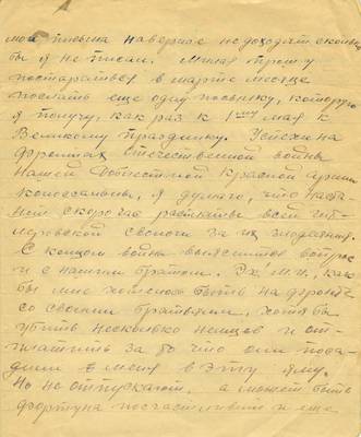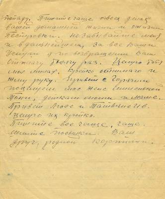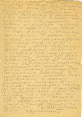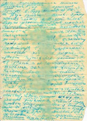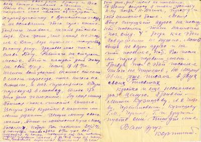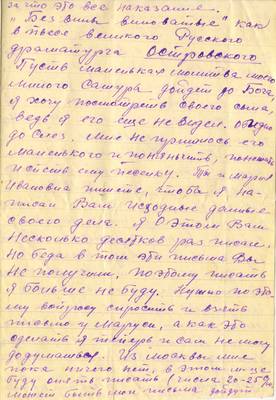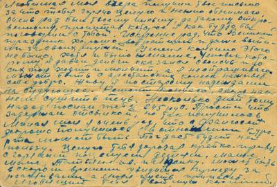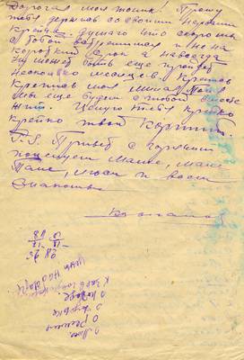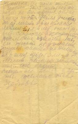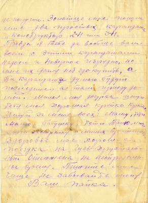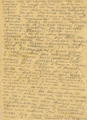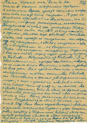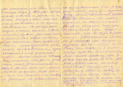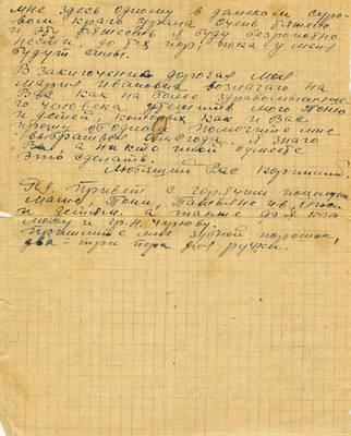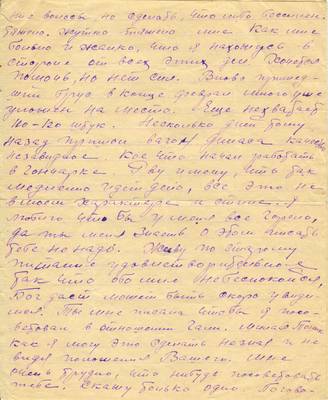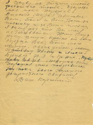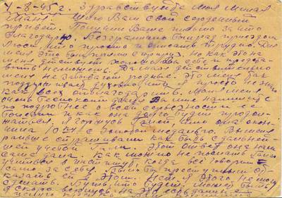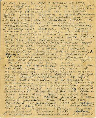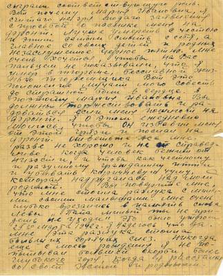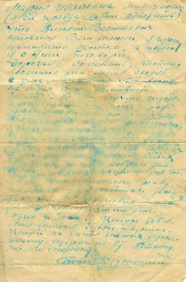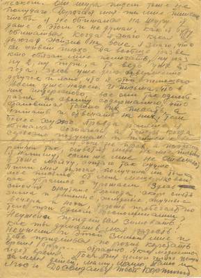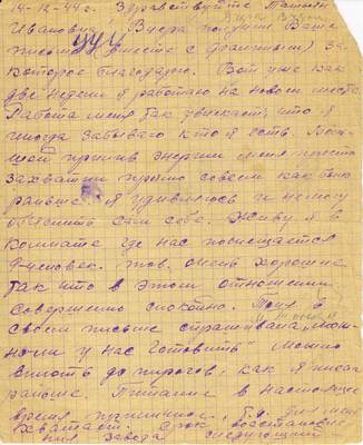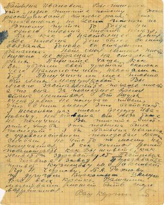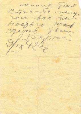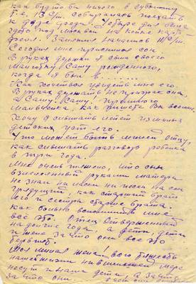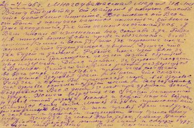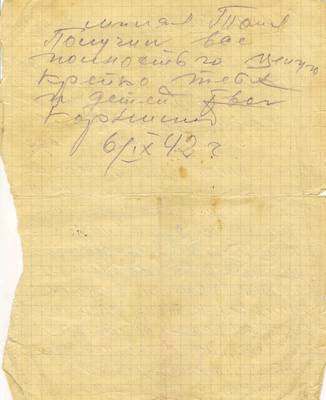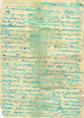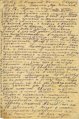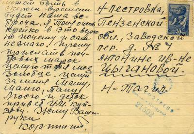 41. Письмо Цыганова К.А. от 13.04.1943 из г. Нижнего Тагила Свердловской области жене Цыгановой А.И. о своем беспокойстве по поводу отсутствия писем в течение 5 с половиной месяцев, о радости от полученной от племянницы Люси открытки, о том, что не нужно присылать денег, об огорчении от того, что посылки на почте не принимают, с просьбой к (сестре ?) Шуре приехать на свидание, об отправке очередного прошения о помиловании в марте 1943; с припиской «Получено 28 апреля».