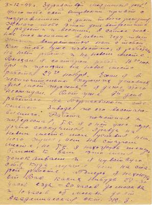 95. Письмо Цыганова К.А. от 03.12.1944 со ст. Академическая Октябрьской железной дороги дочери Цыгановой Г.К. о своей новой работе на Борисовском стекольном заводе, об условиях жизни, о том, что теперь он гораздо ближе к семье, и с поздравлениями с ее днем рождения.