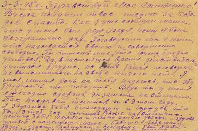 101. Письмо Цыганова К.А. от 03.03.1945 со ст. Академическая Октябрьской железной дороги (на почтовой карточке) дочери Цыгановой Е.К. о приезде к нему Медведева Ф.И. и с пожеланиями успехов в учебе; со штампом «Проверено военной цензурой 01766»; п/ш 07.03.1945/21.03.1945.