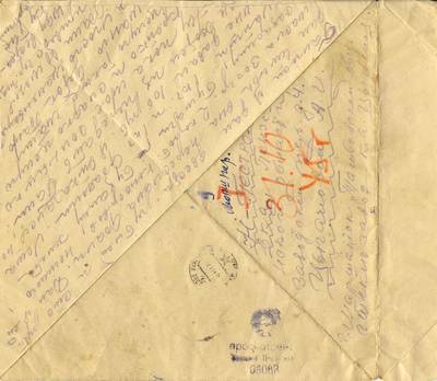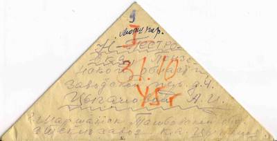 122. Письмо-треугольник Цыганова К.А. от 31.10.1945 из г. Моршанска Тамбовской области жене Цыгановой А.И. о своем приезде на стеклозавод в г. Моршанске для запуска завода, уже третьего за время его пребывания в заключении, о том, что ехал через Москву, где удалось встретиться с дочерью Галей и с Мещеряковыми, о том, очень хотел бы повидать жену, и, если она приедет, то сможет ее хорошо устроить; со штампом «Проверено военной цензурой 05063»; п/ш отсутств/07.11.1945.