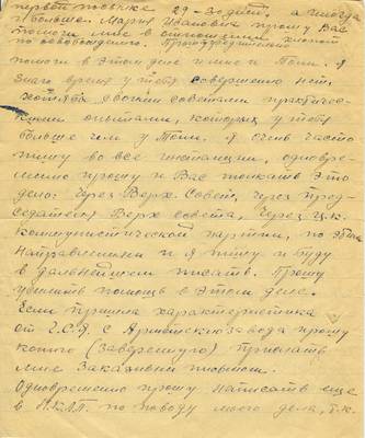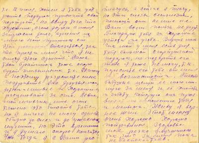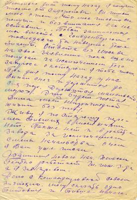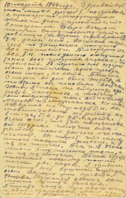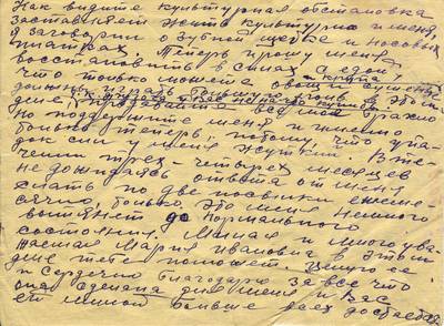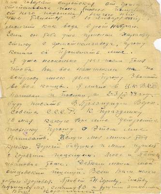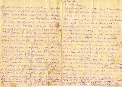 54. Письмо Цыганова К.А. от 23.03.1944 из г. Нижний Тагил Свердловской области Спириной М.И. с благодарностью за посылки, которые помогли ему укрепить здоровье и с просьбой помочь его жене в отправке заявлений во все инстанции о пересмотре его дела.