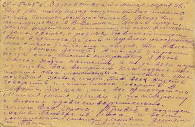 116. Письмо Цыганова К.А. от 29.05.1945 со ст. Академическая Октябрьской железной дороги (на почтовой карточке) Спириной М.И. о командировке в Вышний Волочек и о своей депрессии после там увиденного; со штампом «Проверено военной цензурой 01765»; п/ш 31.05.1945/отсутств.