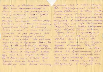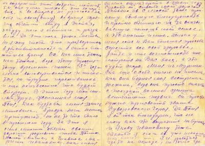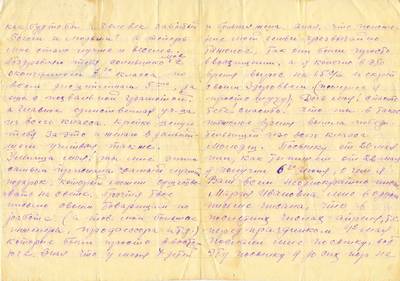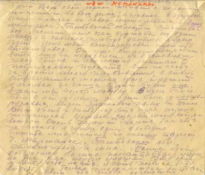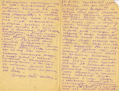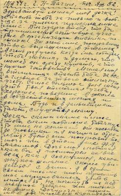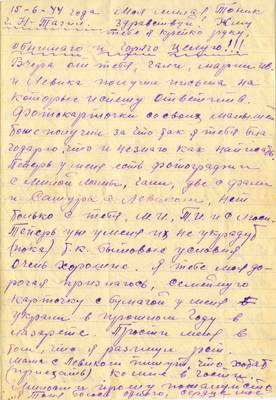 66. Письмо Цыганова К.А. от 15.06.1944 из пос. Красный Камень, г. Нижний Тагил Свердловской области, жене Цыгановой А.И. о получении письма с фотографиями детей и о своей радости по этому поводу, потому что предыдущую семейную фотографию у него украли в прошлом году в лазарете, о том, что мама обещает приехать к нему со старшим сыном, а он боится это встречи, так как может не выдержать слабое сердце, о том, что нужные данные по своему приговору он передал в письменном виде Марусе во время свидания, но Маруся приехать к его семье не смогла, поэтому надо как-то получить эту информацию для дальнейших ходатайств о пересмотре дела.
