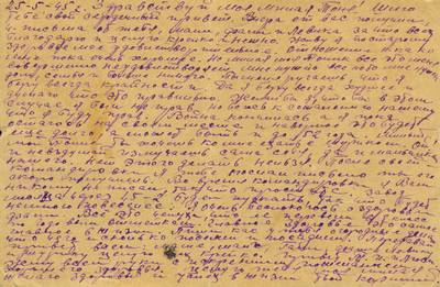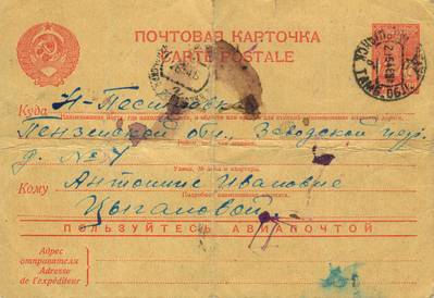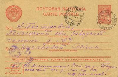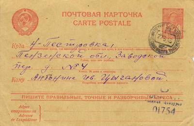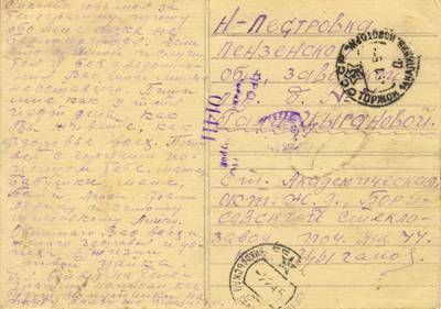 115. Письмо Цыганова К.А. от 25.05.1945 со ст. Академическая Октябрьской железной дороги (на почтовой карточке) жене Цыгановой А.И. о получении четырех писем, о том, что ей не следует приезжать к нему на свидание с сыном Шурой, так как дорога тяжелая, и о беспокойстве за здоровье дочери Фали; со штампом «Проверено военной цензурой 01754»; п/ш 27.05.1945/отсутств.
