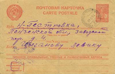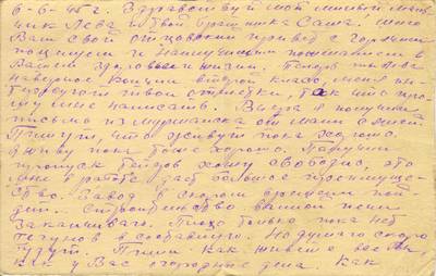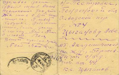 118. Письмо Цыганова К.А. от 06.06.1945 со ст. Академическая Октябрьской железной дороги (на почтовой карточке) сыну Цыганову Л.К. об окончании им второго класса, о своей жизни, о получении пропуска и скором запуске завода; со штампом «Проверено военной цензурой 01765»; п/ш нрзб /отсутств.
