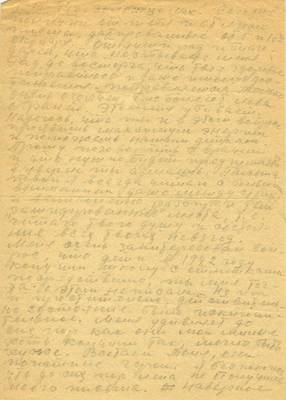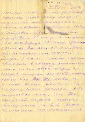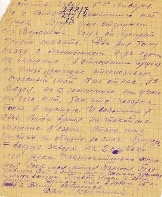 37. Копия письма Цыганова К.А. от 01.02.1943 из г. Нижнего Тагила Свердловской области жене Цыгановой А.И. в Н.-Пестровку Пензенской области об отсутствии от нее писем, об этапировании 28.10.1942 и о прибытии 05.12.1942 в Тагиллаг НКВД, о работе на стройке арматурщиком, о том, насколько его положение в пензенской тюрьме было лучше, о своих тревоге за семью и о продуктах, которые нужны особенно остро; с припиской «Получено 08.03.1943 в 12 часов дня в понедельник».