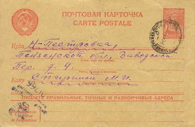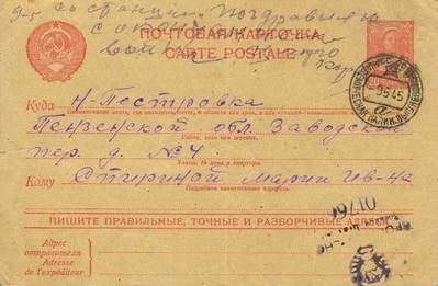 110. Письмо Цыганова К.А. от 26.04.1945 со ст. Академическая Октябрьской железной дороги (на почтовой карточке) Спириной М.И. о получении ее писем, об утверждении Пентко Н.А. директором завода и о производственных планах; со штампом «Проверено военной цензурой 01766»; п/ш 28.04.1945/отсутств.
