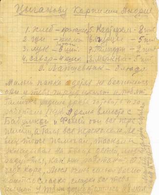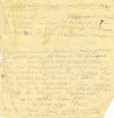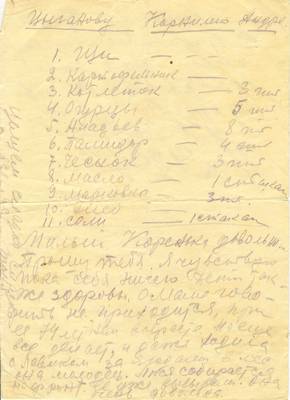 32. Опись передаваемых продуктов Мещеряковой Т.И. в тюрьму Цыганову К.А. с ее запиской и с запиской Цыгановой А.И. (между 15.10.1942 и 28.10.1942) с новостями о детях и матери.