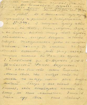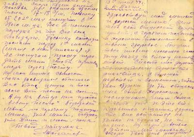 44. Письмо Цыганова К.А. от 14.01.1944 из пос. Красный Камень, г. Нижний Тагил Свердловской области, жене Цыгановой А.И. о своем новом адресе и переводе на работу в проектное бюро инженером-стекольщиком, об улучшении условий жизни, о недавнем пребывании в лазарете и слабости, о неполучении посылки, отправленной 15 декабря, о посылке, посланной знакомым; с припиской «Получено 30.01.1944».