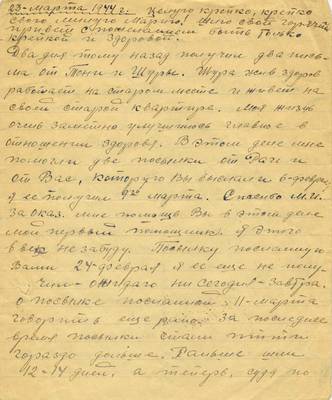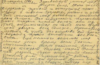 53. Письмо Цыганова К.А. от 23.03.1944 из пос. Красный Камень, г. Нижний Тагил Свердловской области (на почтовой карточке) дочери Цыгановой Г.К. с благодарностью за письма и с просьбой присылать посылки чаще и регулярнее; со штампом «Проверено военной цензурой 13447»; (п/ш нрзб/12.04.1944).