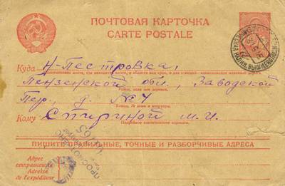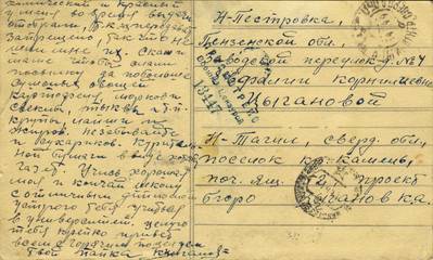 46. Письмо Цыганова К.А. от 09.03.1944 из пос. Красный Камень, г. Нижний Тагил Свердловской области (на почтовой карточке) жене Цыгановой А.И. о получении от нее двух посылок, о посланном в Президиум Верховного совета СССР заявлении с просьбой отправить его на фронт; со штампом «Проверено военной цензурой 18374»; (п/ш нрзб/22.04.1944).