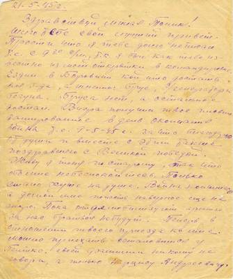 113. Письмо Цыганова К.А. от 08.05.1945 со ст. Академическая Октябрьской железной дороги (на почтовой карточке) Спириной М.И. о получении ее открытки, о беспокойстве за здоровье дочери Фали и о ее беспокойстве об учебе, с просьбой сообщить об Арсении – умер ли он, о завтрашней командировке в Боровичи и о хороших отношениях с директором завода; со штампом «Проверено военной цензурой 01766»; п/ш 09.05.1945/отсутств.; с припиской «Со станции. Поздравляю с окончанием войны! Целую. Корнелий».