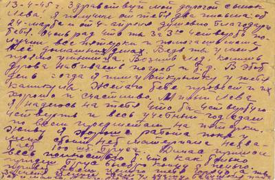 106. Письмо Цыганова К.А. от 13.04.1945 со ст. Академическая Октябрьской железной дороги (на почтовой карточке) сыну Цыганову Л.К. о получении двух его писем, о радости за его хорошую учебу и помощь матери в домашних делах и о производственных проблемах на заводе; со штампом «Проверено военной цензурой 01766»; п/ш 15.05.1945/отсутств.
