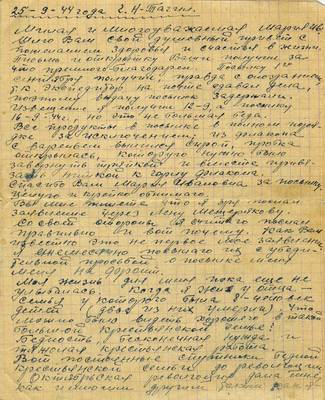 77. Письмо Цыганова К.А. от 25.09.1944 из пос. Красный Камень, г. Нижний Тагил Свердловской области Спириной М.И. о получении от нее посылки, о том, что ежемесячно отсылает заявления с просьбой отправить его на фронт, о своей жизни до ареста и о том, что с ним произошла судебная ошибка.
