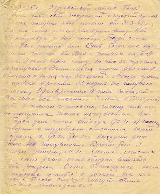 103. Письмо Цыганова К.А. от 05.03.1945 со ст. Академическая Октябрьской железной дороги жене Цыгановой А.И. о том, что он пишет много писем, но не все доходят, о своей старой болезни желудка, о получении известия о нахождении племянника Юрия в госпитале и плохом здоровье брата Арсения, о производственных проблемах завода и о том, что пока приезжать к нему не нужно.