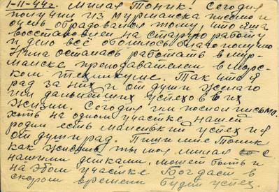 86. Письмо Цыганова К.А. от 01.11.1944 из пос. Красный Камень, г. Нижний Тагил Свердловской области (на почтовой карточке) жене Цыгановой А.И. о получении хороших известий от родни из Мурманска; со штампом «Проверено военной цензурой 21502»; п/ш отсутств./отсутств.