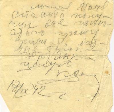26. Опись передаваемых продуктов Цыгановой А.И. в тюрьму Цыганову К.А. с ее запиской о своем скором отъезде с маленьким сыном, на обороте - приписка Цыганова К.А. от 17.09.1942 о получении передачи и с просьбой принести портянки.