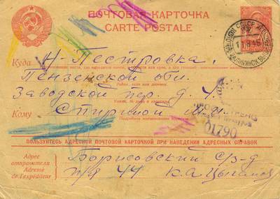 99. Письмо Цыганова К.А. от 19.01.1945 со ст. Академическая Октябрьской железной дороги (на почтовой карточке) дочери Цыгановой Г.К. о том, что его долгое молчание вызвано занятостью на работе, о получении денежного перевода от сестры, которого надолго хватит на покупку картошки и молока; со штампом «Проверено военной цензурой 01411»; п/ш 25.01.1945/09.02.1945.