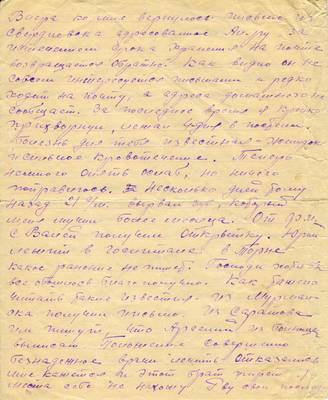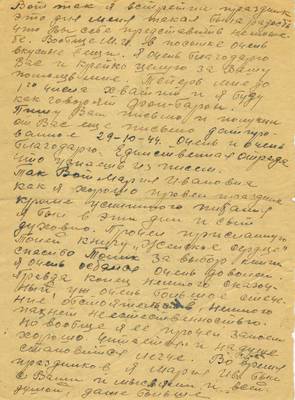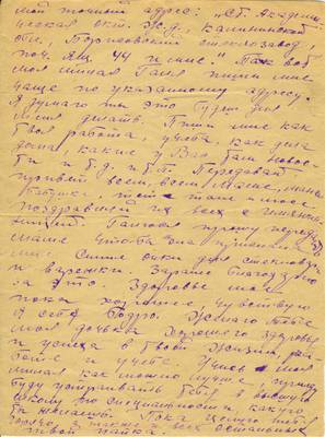 80. Письмо Цыганова К.А. от (октября 1944) из пос. Красный Камень, г. Нижний Тагил Свердловской области, жене Цыгановой А.И. о получении письма от нее и от Люси, о радости по поводу ее улучшившегося здоровья и о переживаниях из-за болезни сына и дочери.