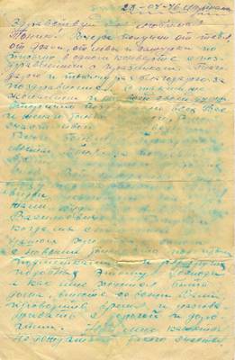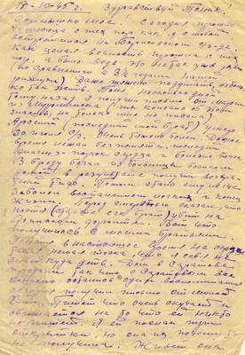 121. Письмо Цыганова К.А. от 17.10.1945 со ст. Академическая Октябрьской железной дороги жене Цыгановой А.И. о том, что прошло 4 месяца с их встречи на Борисовском стеклозаводе, о смерти брата Арсения 30.07.1945 и о смерти брата Константина на финском фронте, о получении письма от дочери Галины, которая учится в Москве, об увиденном во сне сыне Саше, о смене руководства завода и о надежде на освобождение.