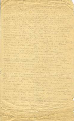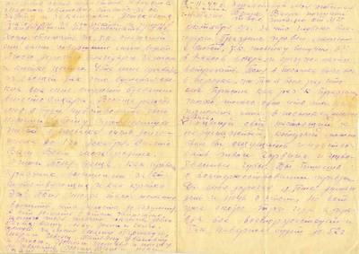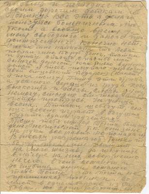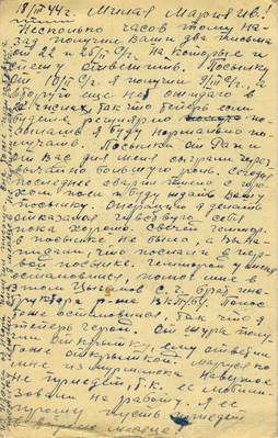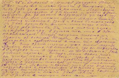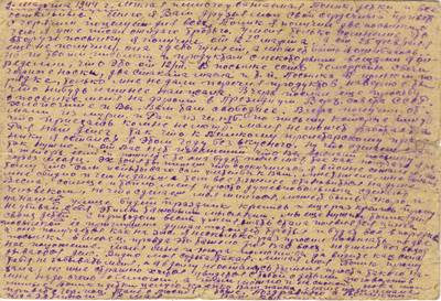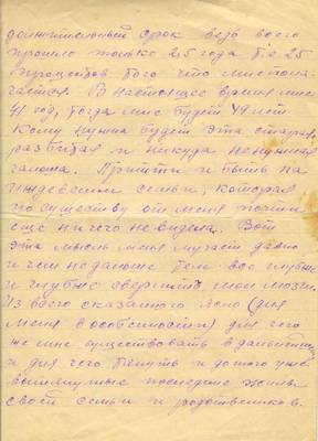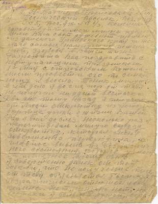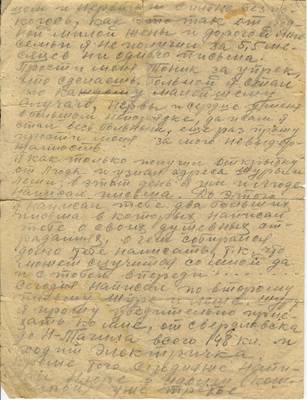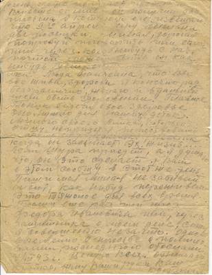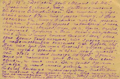 41. Письмо Цыганова К.А. от 13.04.1943 из г. Нижнего Тагила Свердловской области жене Цыгановой А.И. о своем беспокойстве по поводу отсутствия писем в течение 5 с половиной месяцев, о радости от полученной от племянницы Люси открытки, о том, что не нужно присылать денег, об огорчении от того, что посылки на почте не принимают, с просьбой к (сестре ?) Шуре приехать на свидание, об отправке очередного прошения о помиловании в марте 1943; с припиской «Получено 28 апреля».