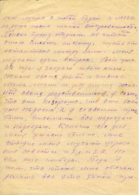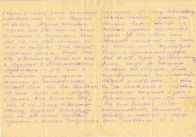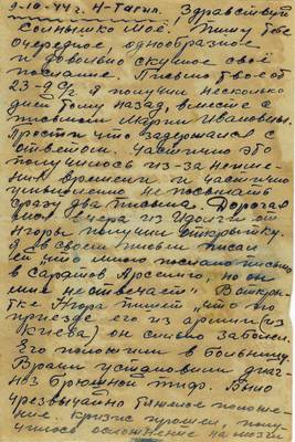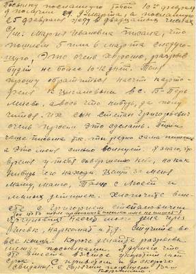 81. Фрагмент письма Цыганова К.А. от 09.10.1944 из пос. Красный Камень, г. Нижний Тагил Свердловской области, жене Цыгановой А.И. о новостях от родственников, о сожалении, что дочь Галина не может поехать учиться в Москву, как ее подруги.