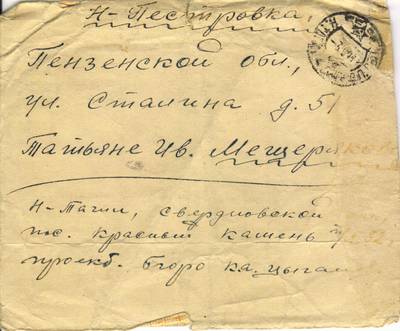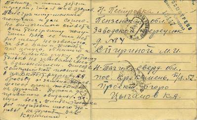 38. Письмо Цыганова К.А. от 20.02.1943 из г. Нижнего Тагила Свердловской области жене Цыгановой А.И. в Н.-Пестровку Пензенской области о том, что уже на 7 или 8 его писем нет ответа, о его беспокойстве, о жизни в лагере, о работе землекопом и с просьбой прислать посылку; с припиской «Это получено в 2 часа дня 07.03.1943, воскресенье»; конверт на имя Мещеряковой Т.И., п/ш 03.04.1943/нрзб, со штампом «Проверено военной цензурой 13431».