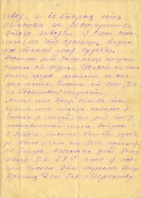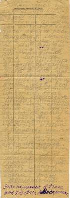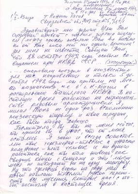 37. Копия письма Цыганова К.А. от 01.02.1943 из г. Нижнего Тагила Свердловской области жене Цыгановой А.И. в Н.-Пестровку Пензенской области об отсутствии от нее писем, об этапировании 28.10.1942 и о прибытии 05.12.1942 в Тагиллаг НКВД, о работе на стройке арматурщиком, о том, насколько его положение в пензенской тюрьме было лучше, о своих тревоге за семью и о продуктах, которые нужны особенно остро; с припиской «Получено 08.03.1943 в 12 часов дня в понедельник».