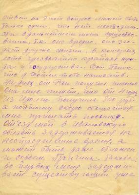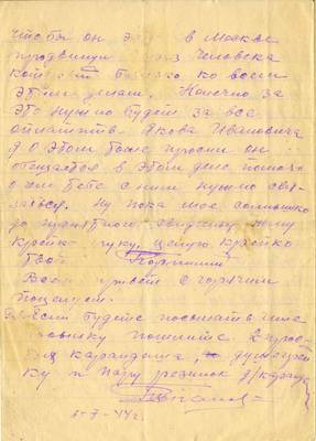 63. Письмо Цыганова К.А., начатое 04.06.1944, оконченное 06.07.1944, из пос. Красный Камень, г. Нижний Тагил Свердловской области, жене Цыгановой А.И. о своих сомнениях по поводу своего дальнейшего существования, так как оказание помощи ему – тяжелое бремя для семьи, а после освобождения в 49 лет он будет старым, больным и бесполезным для семьи, а так же о сборе характеристик, полезных для продолжения хлопот о пересмотре его дела.