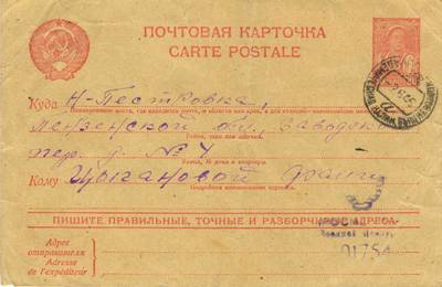 50. Письмо Цыганова К.А. от 18.03.1944 из пос. Красный Камень, г. Нижний Тагил Свердловской области (на почтовой карточке) Спириной Марии Ивановне о получении двух писем и о благодарности за посылки, об отказе от операции и об отправке заявления в ЦК ВКП(б) с просьбой о замене оставшегося срока заключения отправкой на фронт; со штампом «Проверено военной цензурой 13447»; (п/ш нрзб/12.04.1944).