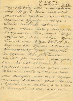 52. Письмо Цыганова К.А. от 19.03.1944 из пос. Красный Камень, г. Нижний Тагил Свердловской области, жене Цыгановой А.И. об отправке открыток всем родным и заявления в ЦК ВКП(б) с просьбой о замене оставшегося срока заключения отправкой на фронт, о своем здоровье, которое улучшилось благодаря посылкам, о визите в управление Тагилстроя для утверждения проекта стекольного завода, им разработанного, и с просьбой продолжать делать все возможной для пересмотра его дела.