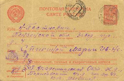 102. Письмо Цыганова К.А. от 04.03.1945 со ст. Академическая Октябрьской железной дороги (на почтовой карточке) Спириной М.И. о том, что пишет десяти адресатам, о своей благодарности за все ею сделанное для него и его семьи, о своей загруженностью работой; со штампом «Проверено военной цензурой 01766»; п/ш 07.03.1945/15.03.1945.