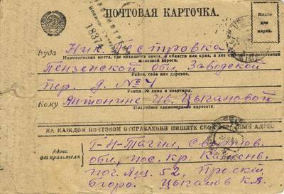 46. Письмо Цыганова К.А. от 09.03.1944 из пос. Красный Камень, г. Нижний Тагил Свердловской области (на почтовой карточке) жене Цыгановой А.И. о получении от нее двух посылок, о посланном в Президиум Верховного совета СССР заявлении с просьбой отправить его на фронт; со штампом «Проверено военной цензурой 18374»; (п/ш нрзб/22.04.1944).