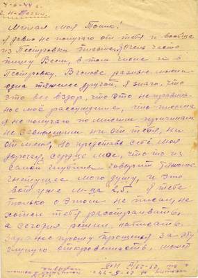 47. Письмо Цыганова К.А. (март-февраль 1944) из пос. Красный Камень, г. Нижний Тагил Свердловской области, жене Цыгановой А.И. с поздравлениями по поводу ее дня рождения, о сожалениях, что его в этот день нет рядом, о необходимости операции, о плохом самочувствии и упадке сил, и об отсутствии писем.