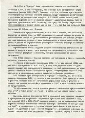 1. Копия письма полпреда УССР в РСФСР Полоза М.Н. от 24.01.1923 секретарю ЦК РКП(б) Сталину И.В. о заметке: «Союзный ВСНХ», опубликованной в газете «Правда», с возражениями по поводу этой публикации; с комментариями Полоз Р.М.