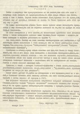 2. Копия рапорта опер. секретаря СПО Эдельмана от января 1934 г. начальнику СПУ ОГПУ т. Молчанову от аресте Полоза М.Н. и обыске в его квартире.