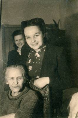 4. Фотография Мягковой (Тимофеевой) Ф.Я. (сидит) с внучками Бельской Г. и Полоз Р.М. (на заднем плане), 1948 г.