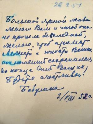 6. Фотография Мягковой (Тимофеевой) Ф.Я., 26.02.1951, с надписью на обороте: «Большой яркой любви желаю Вам и чтоб она не прошла бесследной, желаю, чтоб аромат свежести и юности Ваших отношений сохранился до конца дней Ваших. Будьте счастливы! Бабушка. 02.08.1952».